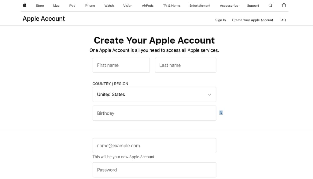 - Visit the Account Creation Page: Go to the account creation and click on “Create Your Apple Account.”